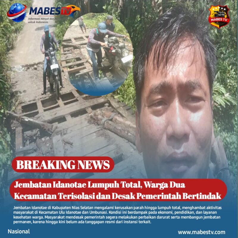Nias Selatan // mabestv.com — Kondisi memprihatinkan terjadi di Kecamatan Ulu Idanotae, Kabupaten Nias Selatan. Jembatan Idanotae yang selama ini menjadi akses penghubung utama masyarakat dilaporkan lumpuh total akibat kerusakan parah, Jumat (17/04/2026).