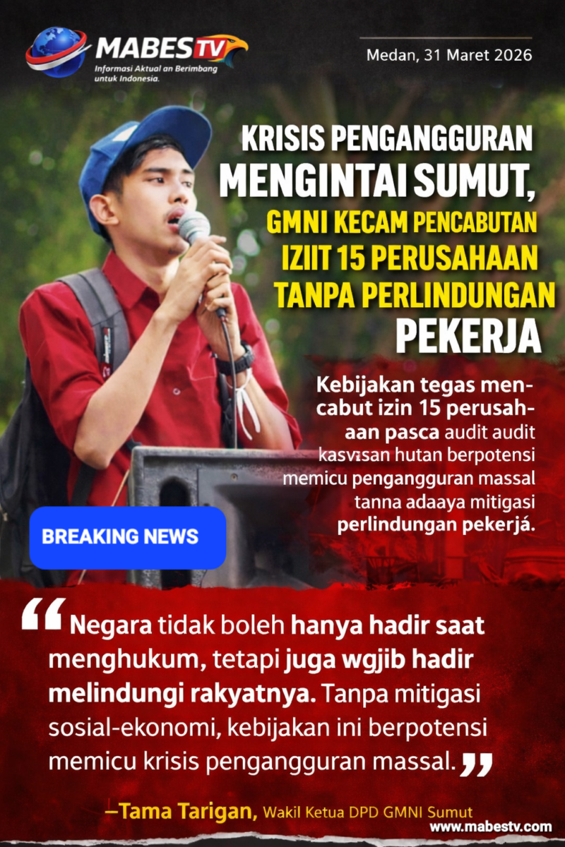 Sumut // mabestv.com — Gelombang ancaman pengangguran massal membayangi Sumatera Utara menyusul pencabutan izin operasional 15 perusahaan oleh pemerintah pusat. Kebijakan yang lahir dari audit Satgas Penertiban Kawasan Hutan pasca banjir besar November 2025 itu menuai kritik keras dari DPD GMNI Sumatera Utara karena dinilai mengabaikan perlindungan hak pekerja. Medan, 31 Maret 2026