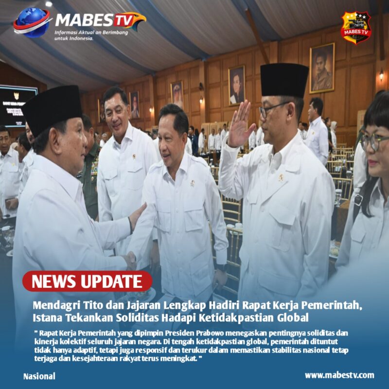 Jakarta // mabestv.com Menteri Dalam Negeri (Mendagri) Muhammad Tito Karnavian bersama jajaran lengkap Kementerian Dalam Negeri menghadiri Rapat Kerja Pemerintah yang dipimpin langsung Presiden Prabowo Subianto di Kompleks Istana Kepresidenan Jakarta, Rabu (8/4/2026). Kehadiran Mendagri didampingi tiga Wakil Menteri Dalam Negeri, yakni Ribka Haluk, Bima Arya Sugiarto, dan Akhmad Wiyagus, serta seluruh pejabat eselon I Kemendagri.