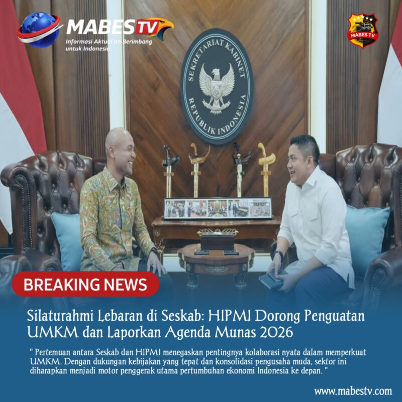 Jakarta // mabestv.com 7 April 2026 — Sekretaris Kabinet Teddy Indra Wijaya menerima kunjungan Ketua Umum Himpunan Pengusaha Muda Indonesia (HIPMI), Akbar Himawan Buchari, di Kantor Sekretariat Kabinet, Senin (6/4/2026). Pertemuan yang berlangsung dalam suasana Idulfitri ini tidak sekadar silaturahmi, tetapi juga menjadi forum strategis membahas masa depan sektor usaha mikro, kecil, dan menengah (UMKM).