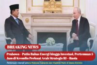 Moskow, Rusia // mabestv.com — Presiden Prabowo Subianto langsung tancap gas setibanya di Rusia dengan agenda tingkat tinggi bersama Presiden Vladimir Putin. Pertemuan berlangsung…