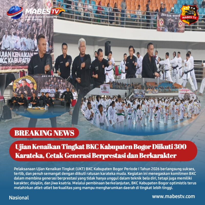Bogor // mabestv.com Pengurus Cabang Bandung Karate Club (BKC) Kabupaten Bogor kembali menunjukkan eksistensinya dalam pembinaan olahraga bela diri dengan sukses menggelar Ujian Kenaikan Tingkat (UKT) Periode I Tahun 2026 di GOR Laga Tangkas, Pakansari, Cibinong, Minggu (19/4/2026).