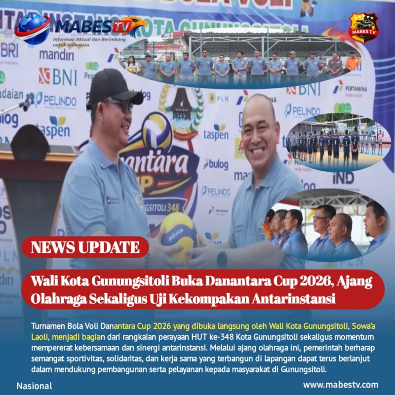 Gunungsitoli // mabestv.com — Semarak peringatan Hari Ulang Tahun ke-348 Kota Gunungsitoli semakin terasa dengan dibukanya Turnamen Bola Voli Danantara Cup 2026 oleh Wali Kota Gunungsitoli, Sowa’a Laoli, Selasa (14/4/2026). Kegiatan yang digelar di Lapangan Bola Voli Pertamina Gunungsitoli ini tak sekadar seremoni olahraga, tetapi juga menjadi panggung konsolidasi kekuatan antarinstansi.